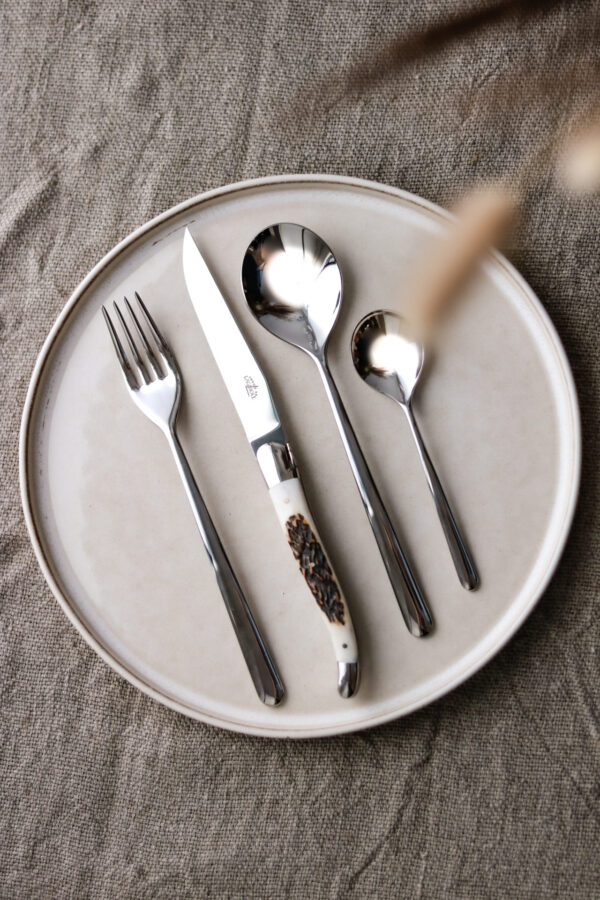 Um diese Präsentation noch zu perfektionieren, bieten wir mit Forge de Laguiole zwei neue elegante Bestecklinien an: Essentielle und Elegance - aus einem Stück geschmiedet und aus rostfreiem Stahl. Gabeln, Löffel und Kaffeelöffel beider Linien harmonisieren perfekt mit unseren Tafelmesser der Linie Tradition und Signature.