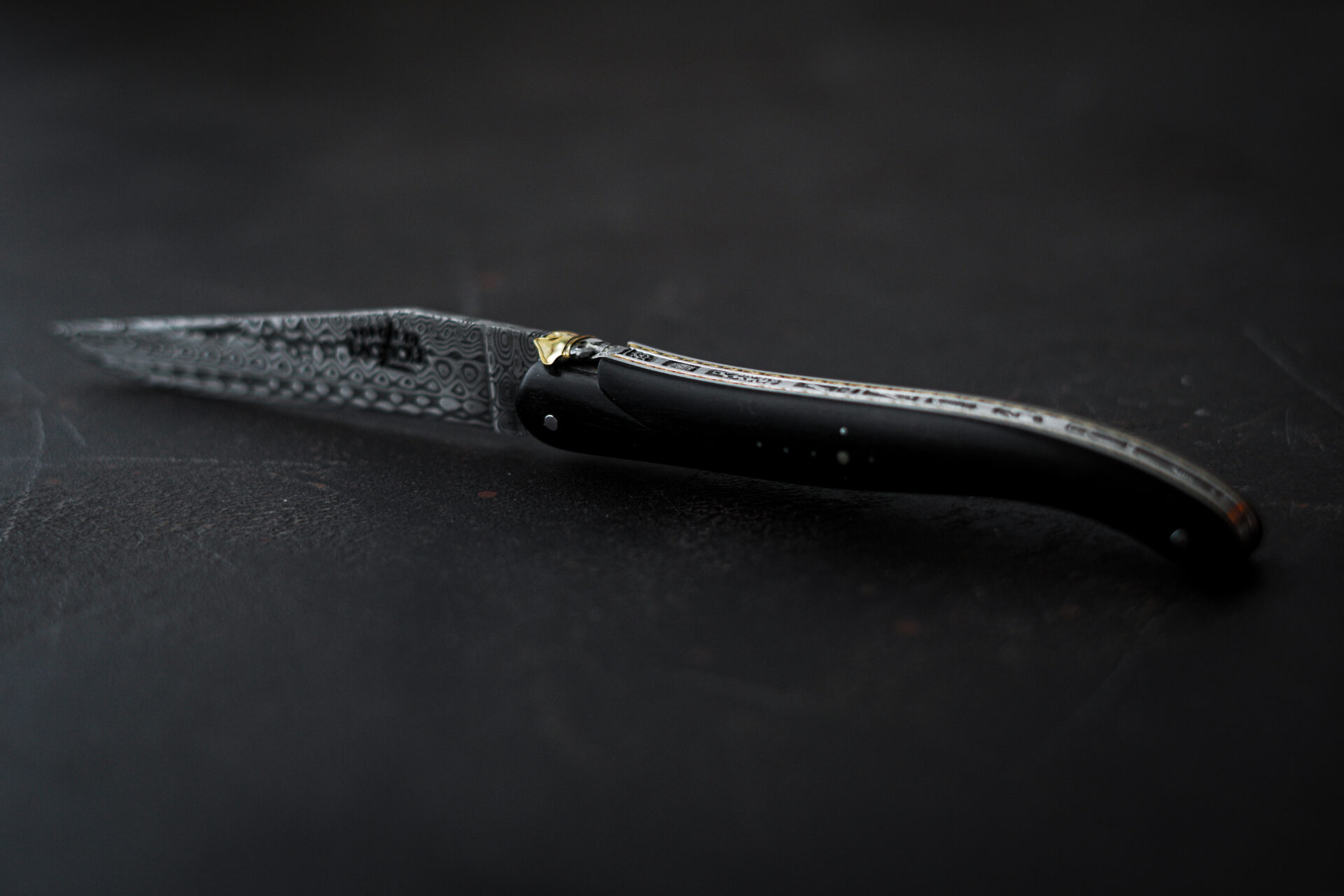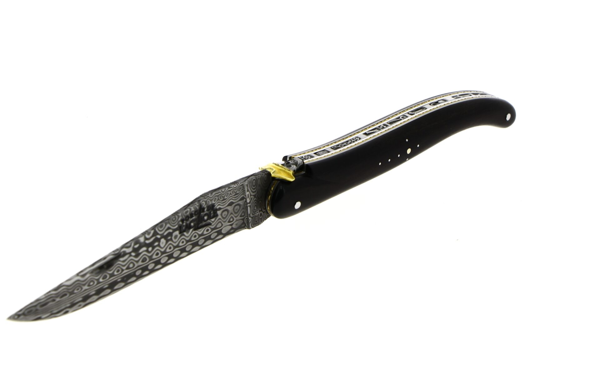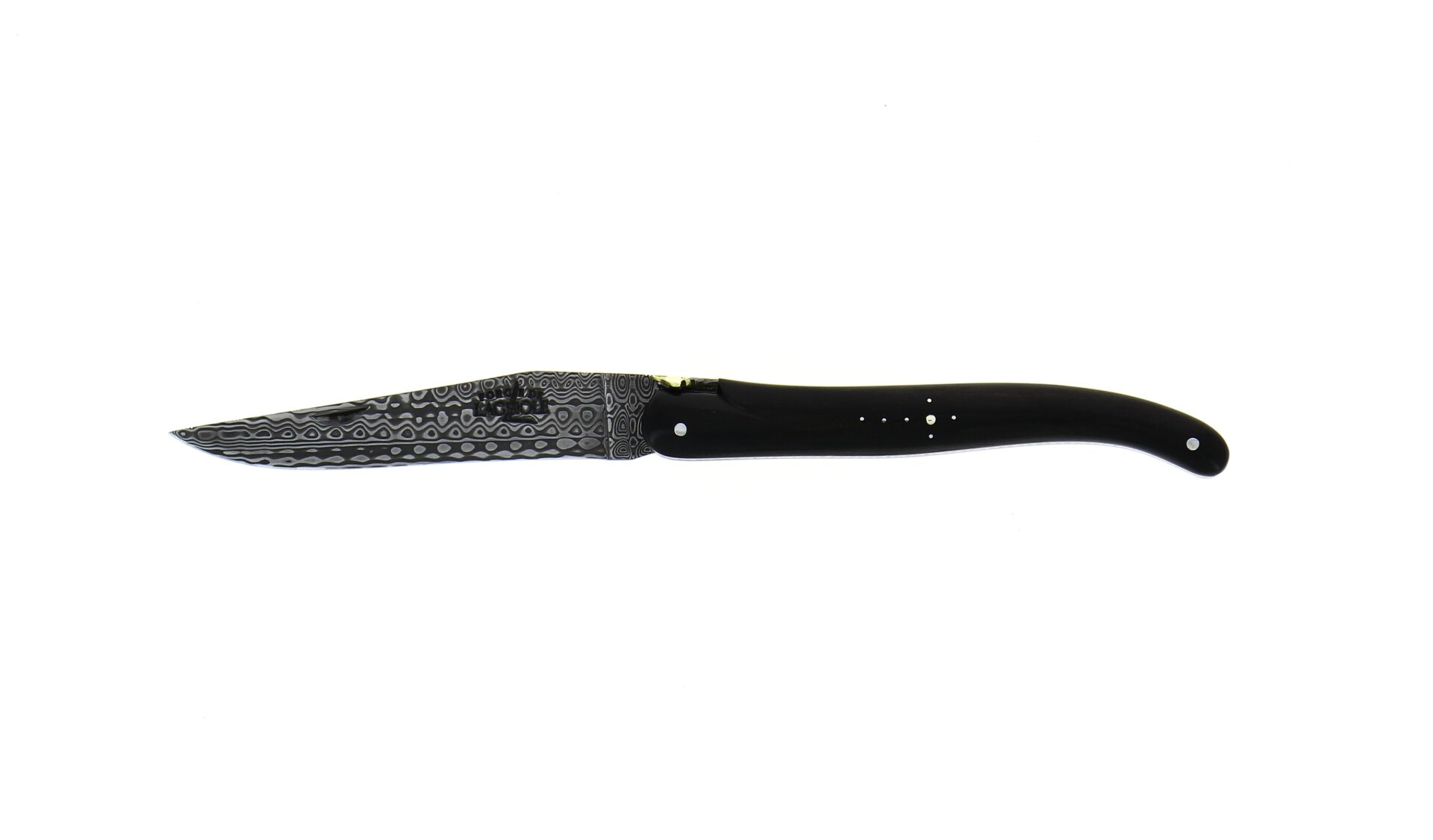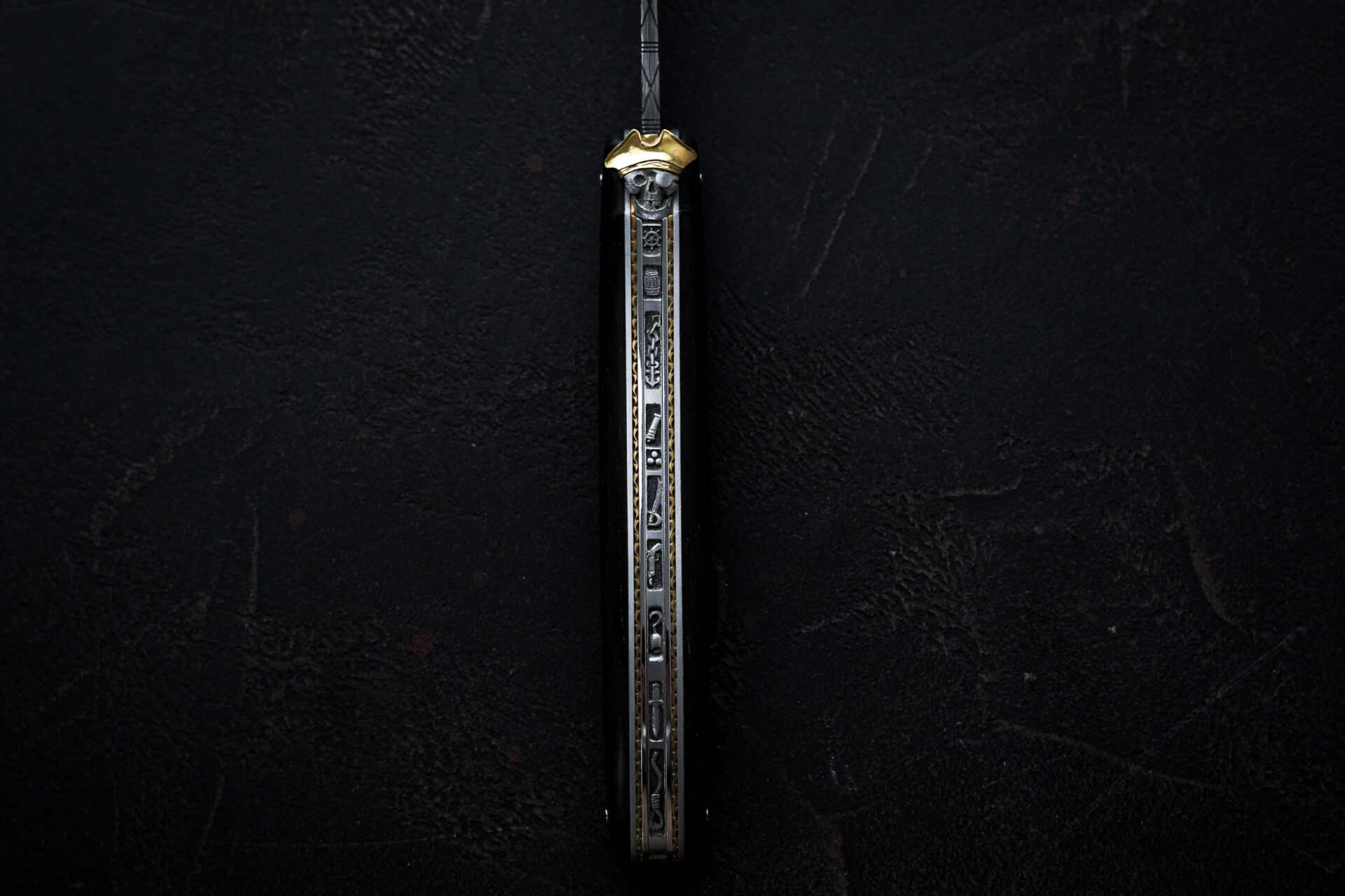 Dieses außergewöhnliche Laguiole-Klappmesser ist ein 12-cm-Einzelstück mit einem vollständig aus Ebenholz gefertigten Griff. Es zeichnet sich durch eine Feder und Klinge mit fein gravierten Piratenmotiven sowie Messingplatinen aus. Die traditionelle Biene wurde durch einen Schädel mit dreifarbiger Messingmütze ersetzt, der diesem Klappmesser eine einzigartige und kühne Note verleiht.