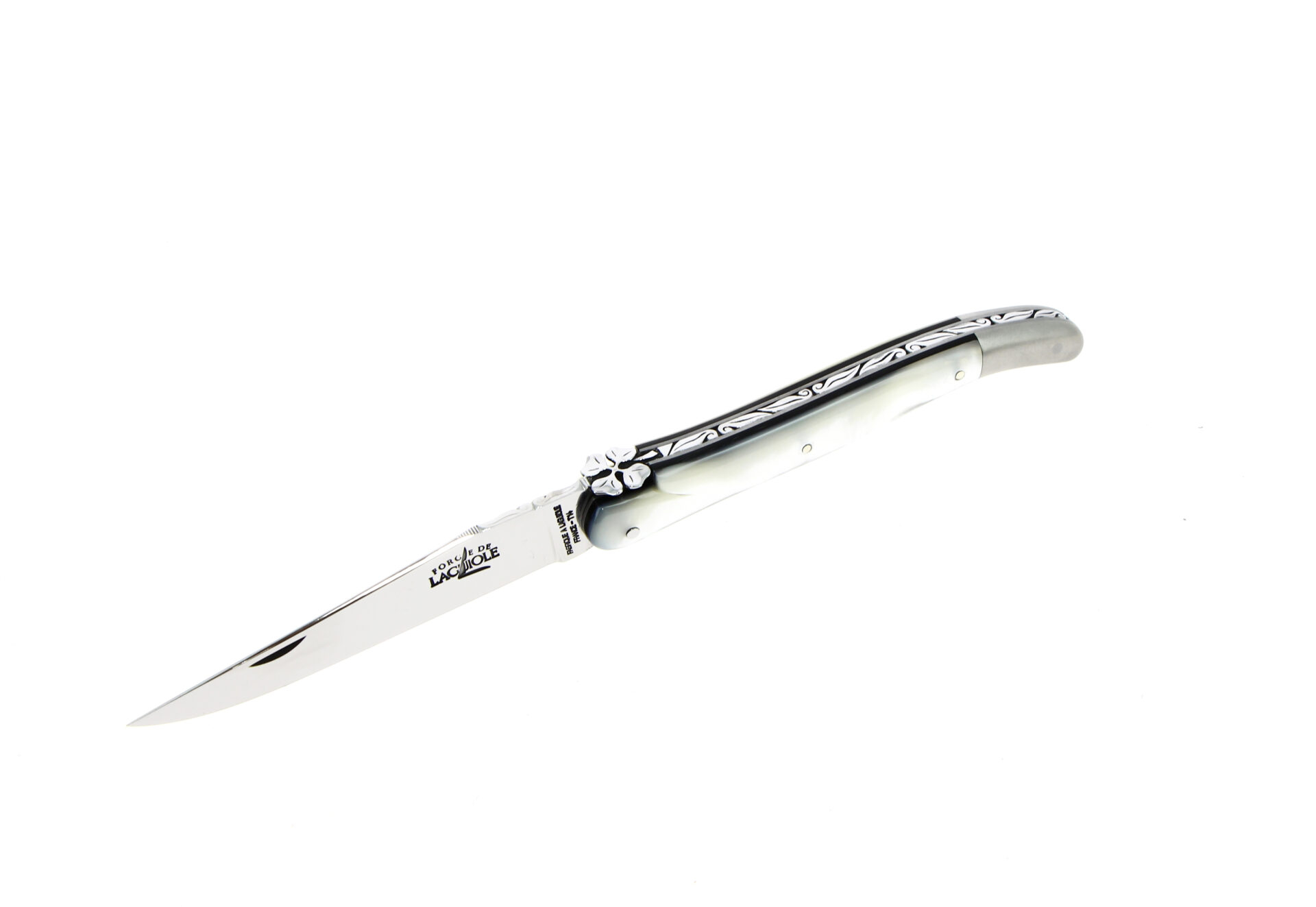 Dieses außergewöhnliche Laguiole-Messer ist ein 11-cm-Modell mit einem Griff aus Perlmutt, einem edlen Material mit feinen, schimmernden Reflexen.