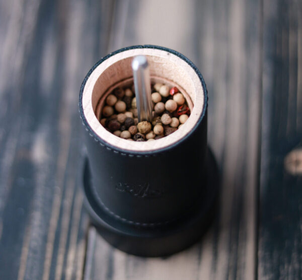 Jedes Modell besteht aus einem Holzsockel, der mit einer eleganten Hülle aus echtem Leder verkleidet ist - grau für Salz und schwarz für Pfeffer. Die große Neuheit dieses neuen Modells ist sein Mechanismus aus Keramik, der einstellbare Mahlgrad und die dreifache Speicherkapazität.