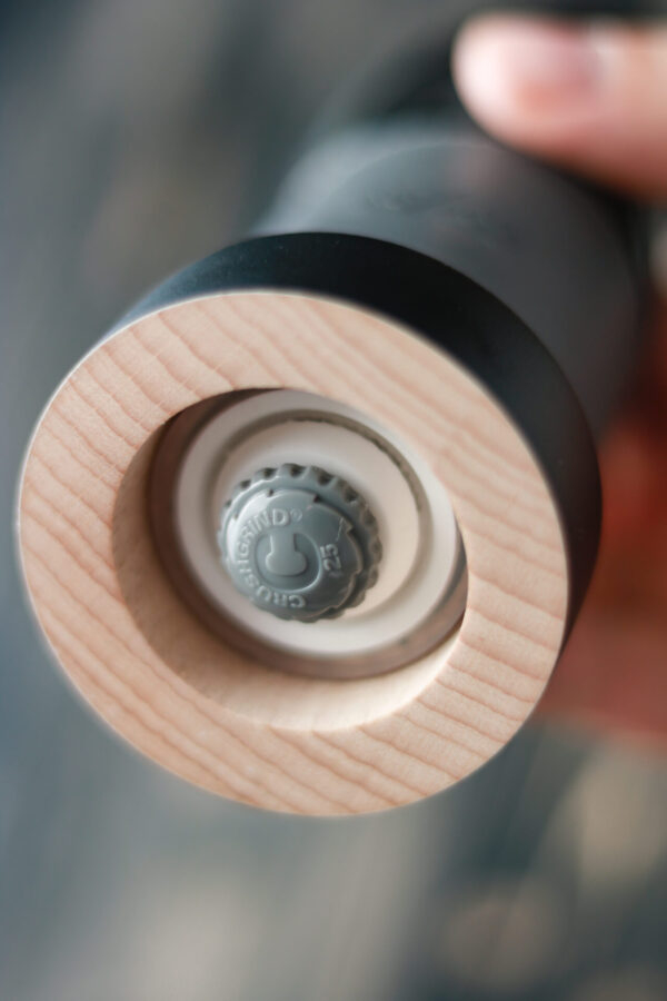 Jedes Modell besteht aus einem Holzsockel, der mit einer eleganten Hülle aus echtem Leder verkleidet ist - grau für Salz und schwarz für Pfeffer. Die große Neuheit dieses neuen Modells ist sein Mechanismus aus Keramik, der einstellbare Mahlgrad und die dreifache Speicherkapazität.