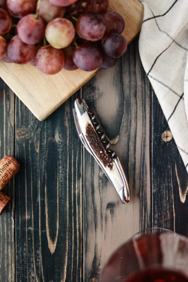 Sommelier Messer, Finish glänzend mit Griff aus Hirschhorn mit Gravur des Hebels.