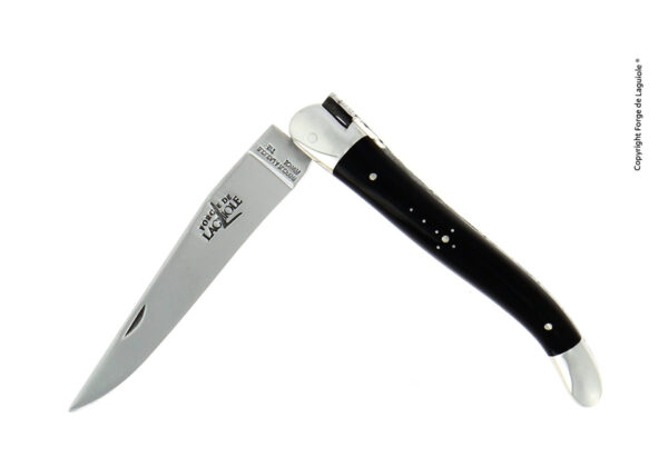 Dieses Forge de Laguiole® Taschenmesser mit einem Griff aus elegantem, dunklem Horn wurde in unserer Manufaktur in Laguiole, Frankreich, handgefertigt, einer Tradition folgend, die bis ins Jahr 1828 zurückreicht. Es hat zwei Mitres aus Inox, welche den Griff im täglichen Gebrauch schützen.