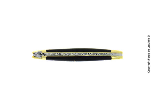 Dieses Forge de Laguiole® Taschenmesser mit einem eleganten Griff aus schwarzer, gepresster Verbundfaser, wurde in unserer Manufaktur in Laguiole, Frankreich, handgefertigt, einer Tradition folgend, die bis ins Jahr 1828 zurückreicht. Es hat zwei Mitres aus Messing, welche den Griff im täglichen Gebrauch schützen.