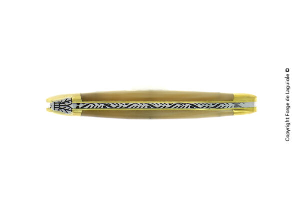 Dieses Forge de Laguiole® Taschenmesser mit einem eleganten Griff aus hellem Horn, wurde in unserer Manufaktur in Laguiole, Frankreich, handgefertigt, einer Tradition folgend, die bis ins Jahr 1828 zurückreicht. Es hat zwei Mitres aus Messing, welche den Griff im täglichen Gebrauch schützen.