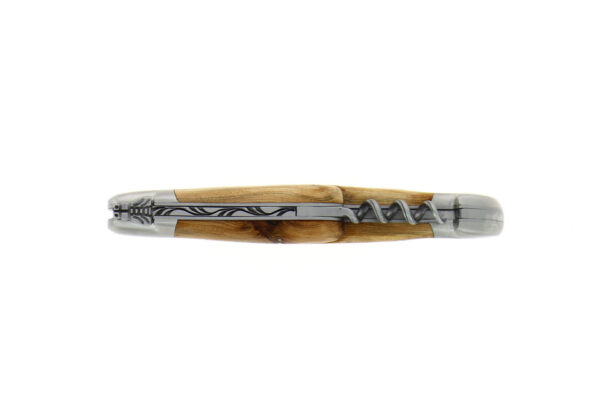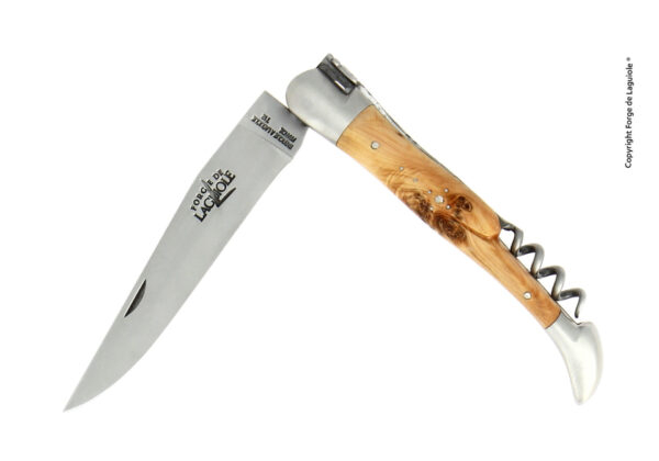 Dieses Forge de Laguiole® Taschenmesser mit einem eleganten Griff aus Wacholder, wurde in unserer Manufaktur in Laguiole, Frankreich, handgefertigt, einer Tradition folgend, die bis ins Jahr 1828 zurückreicht. Es hat zwei Mitres aus Inox, welche den Griff im täglichen Gebrauch schützen. Dieses Messer hat auch einen Korkenzieher.