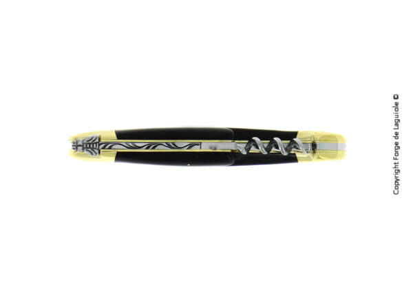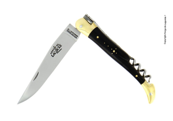 Dieses Forge de Laguiole® Taschenmesser mit einem eleganten Griff aus dunklem Horn, wurde in unserer Manufaktur in Laguiole, Frankreich, handgefertigt, einer Tradition folgend, die bis ins Jahr 1828 zurückreicht. Es hat zwei Mitres aus Messing, welche den Griff im täglichen Gebrauch schützen. Dieses Messer hat auch einen Korkenzieher.