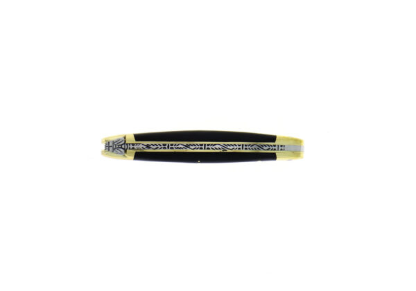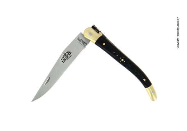 Dieses Forge de Laguiole® Taschenmesser mit einem eleganten Griff aus schwarzer, gepresster Verbundfaser, wurde in unserer Manufaktur in Laguiole, Frankreich, handgefertigt, einer Tradition folgend, die bis ins Jahr 1828 zurückreicht. Es hat zwei Mitres aus Messing, welche den Griff im täglichen Gebrauch schützen.