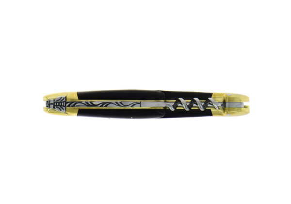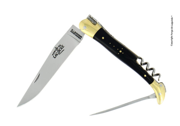 Dieses Forge de Laguiole® Taschenmesser mit einem eleganten Griff aus dunklem Horn, wurde in unserer Manufaktur in Laguiole, Frankreich, handgefertigt, einer Tradition folgend, die bis ins Jahr 1828 zurückreicht. Es hat zwei Mitres aus Messing, welche den Griff im täglichen Gebrauch schützen. Dieses Messer hat auch einen Korkenzieher.