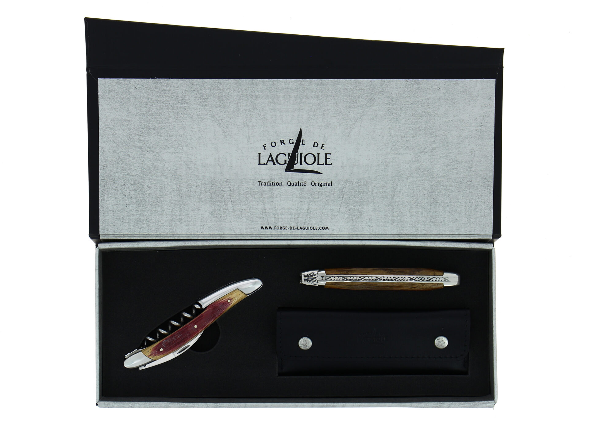 This 12 cm folding knife and sommelier knife, Pinot engraving, Forge de Laguiole TRADITION have barrel oak handles. They feature two stainless steel bolsters and a high polish finish. This sommelier knife have a lever engraved with an elegant shape to magnify this object. The box set also includes a black leather sheath.