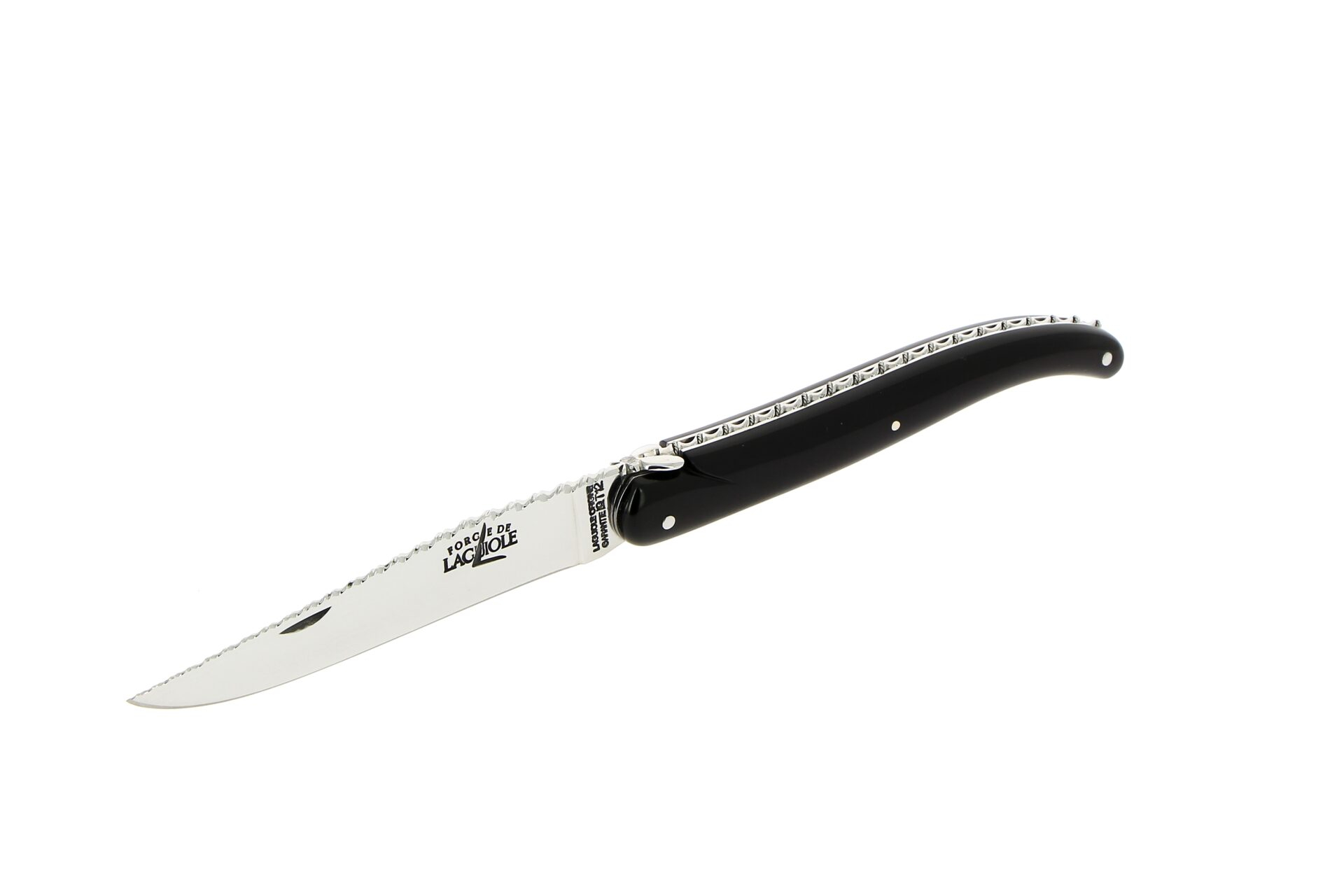 This high-end Laguiole folding knife is a 12 cm one-piece model with a solid black horn handle, offering understated and timeless elegance. It features a twisted-pattern spring, enhanced by brass wires that run harmoniously along the blade.