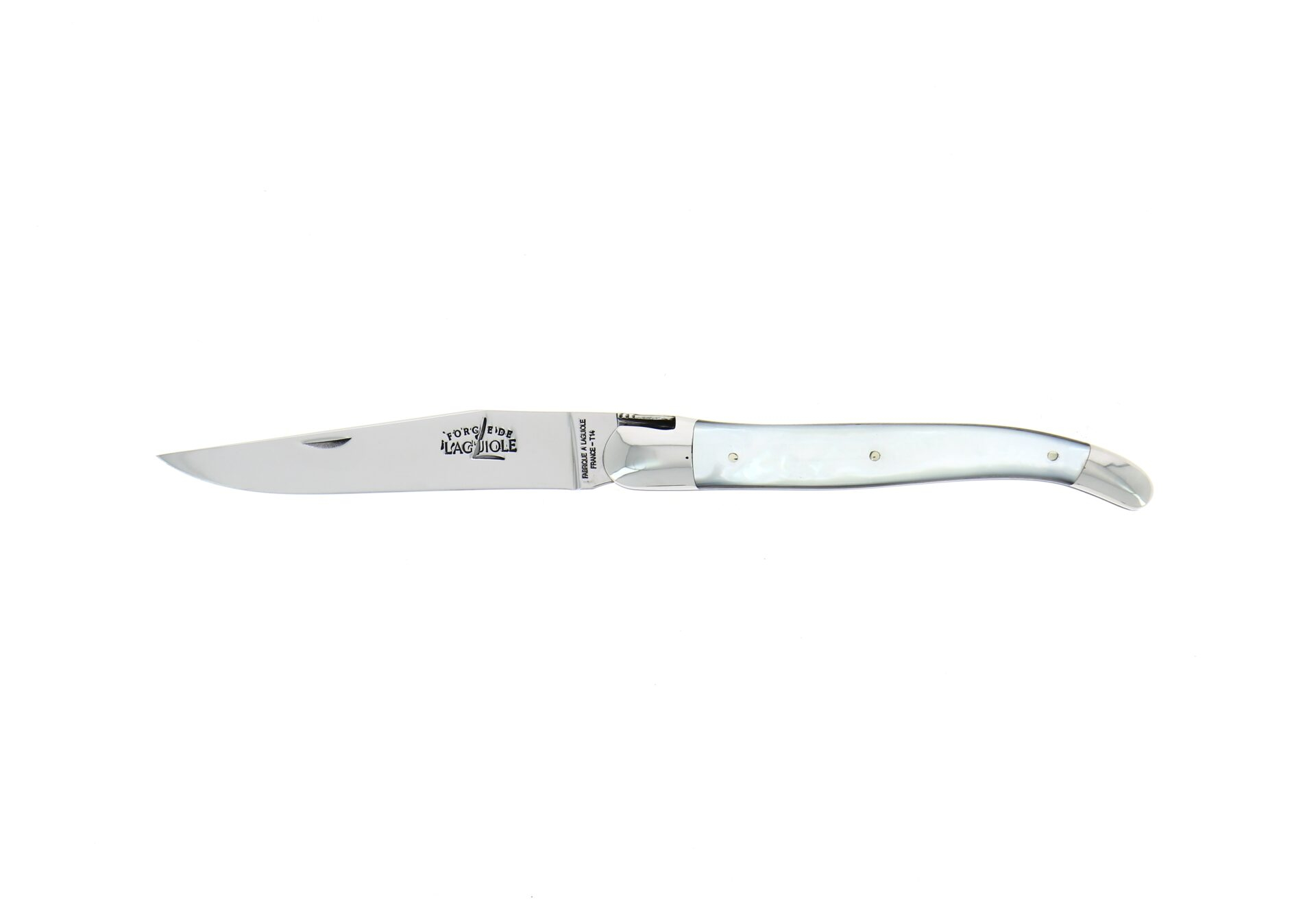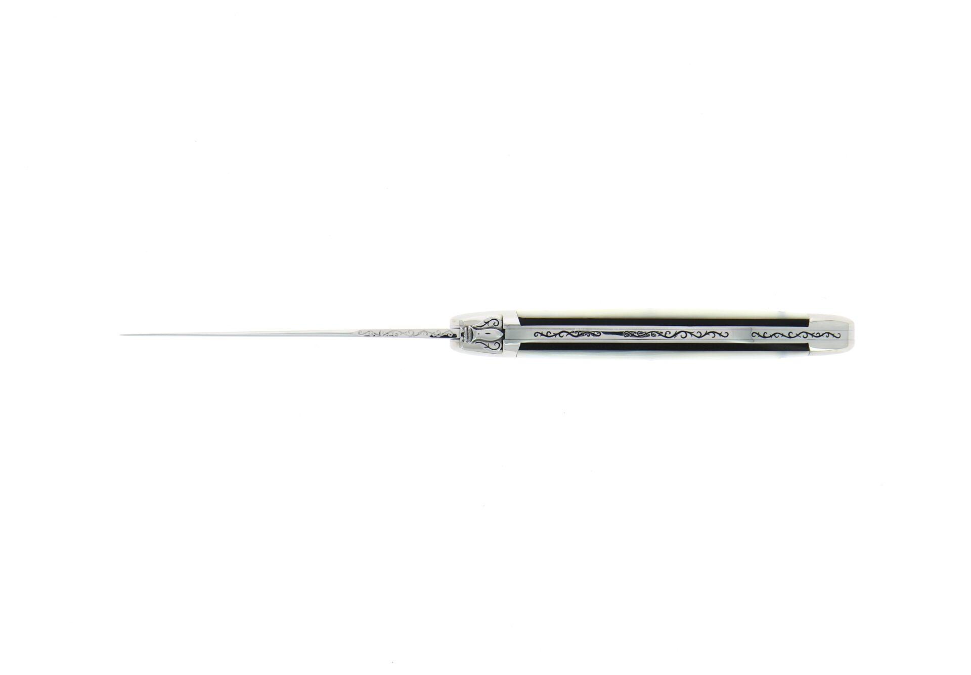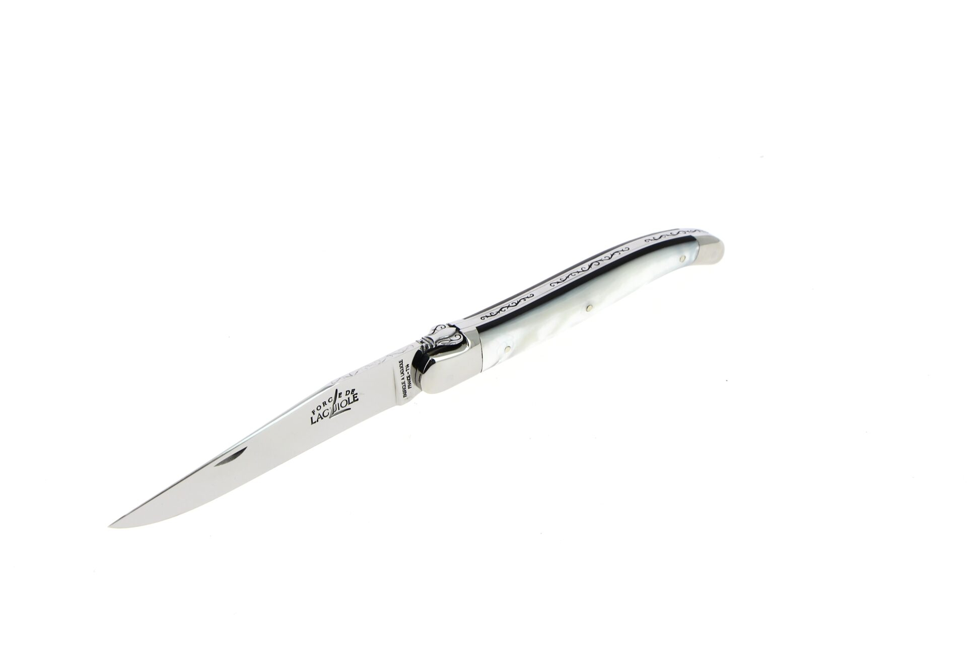 This exceptional folding knife is a 12 cm model, featuring an elegant mother-of-pearl handle with ebony inlay.