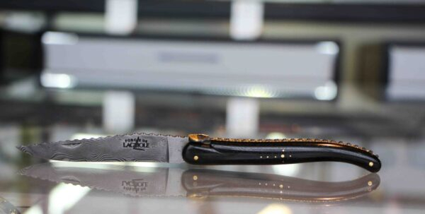 This exceptional knife is a 12 cm 1-piece model, with a ebony handle, with chiselled"vertebra" spring and blade with brass plates. This knife has a skull and crossbones decorated with a brass band instead of a bee. This knife has a. A carbon damascus blade enhances this folding knife.