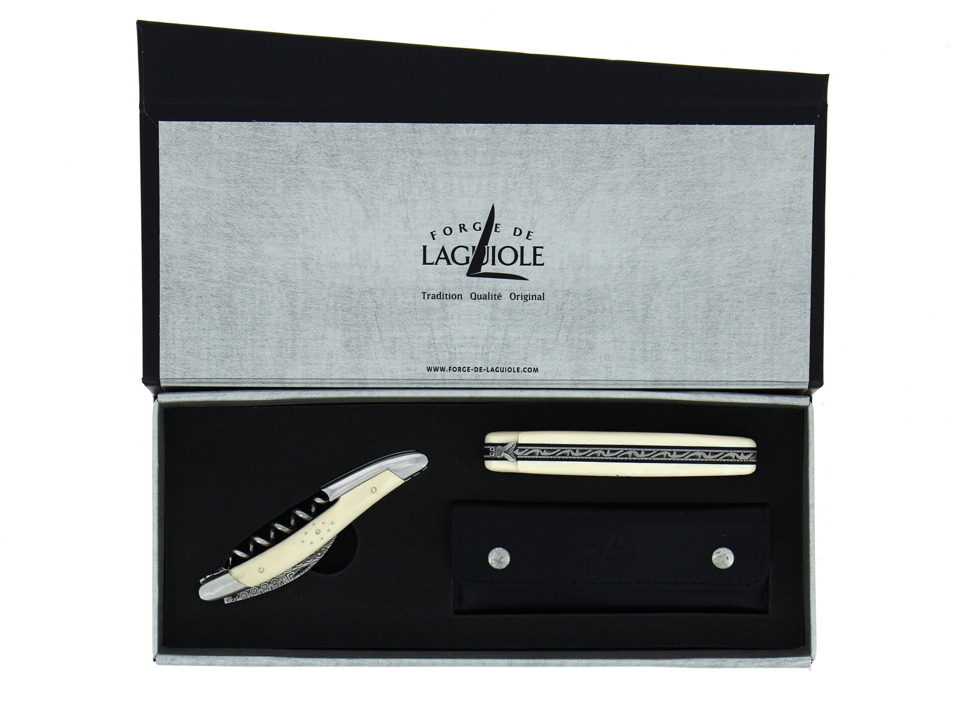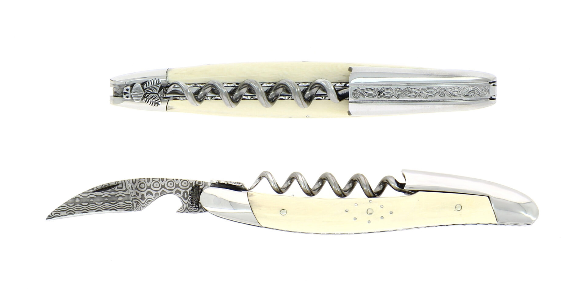 This 12cm folding knife and sommelier knife, Forge de Laguiole COLLECTION - 2025 edition, have a heart of mammoth ivory handle with a high polish finish. The folding knife has a full mammoth ivory handle, a stainless steel Damascus blade, chiseled plates on the top and bottom, and a hand-chiseled bee and spring. The sommelier knife also features a hand-chiseled bee, spring, and plates, as well as a lever engraving with an elegant pattern. The box set also includes a black leather sheath.