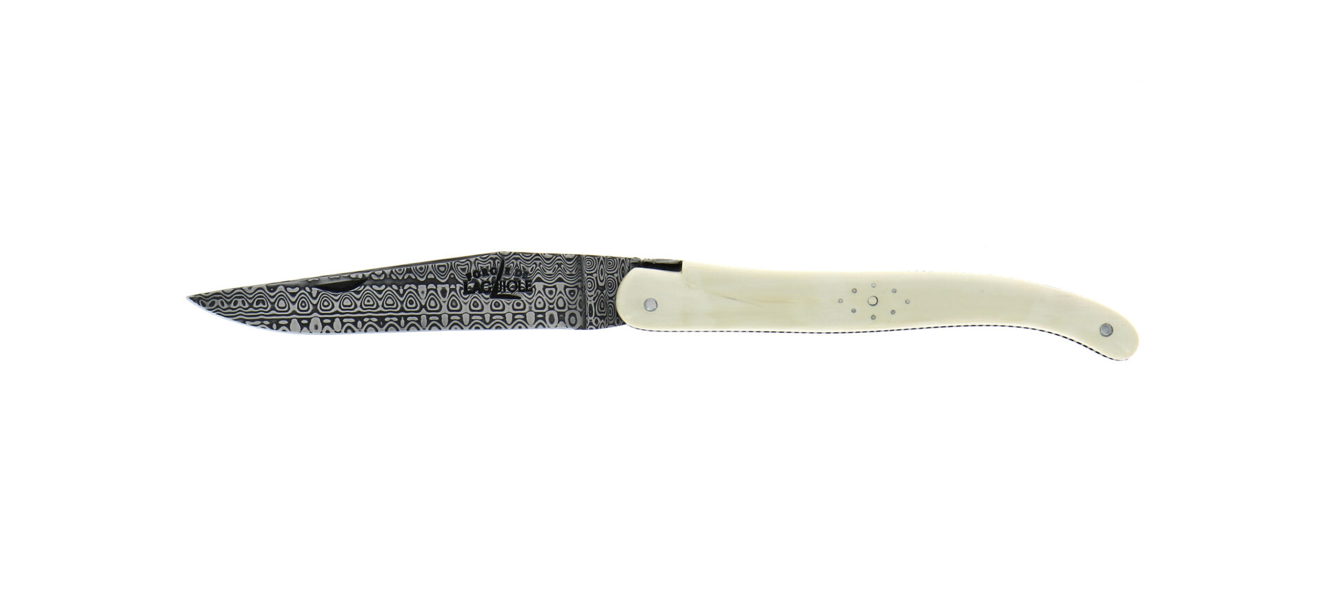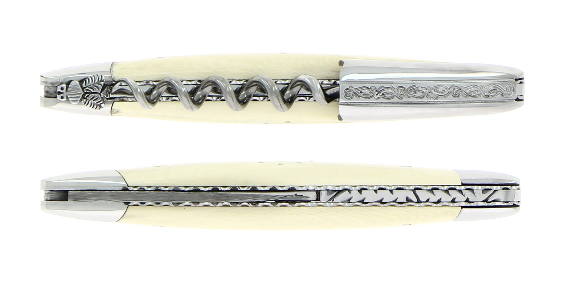 The handle of this knife is made of mammoth ivory. The material of natural origin their appearance (colour, veining, grain) is likely to vary from one item to another. The photos on our official online shop are not contractually binding. The size indicated indicates the length of the closed knife.