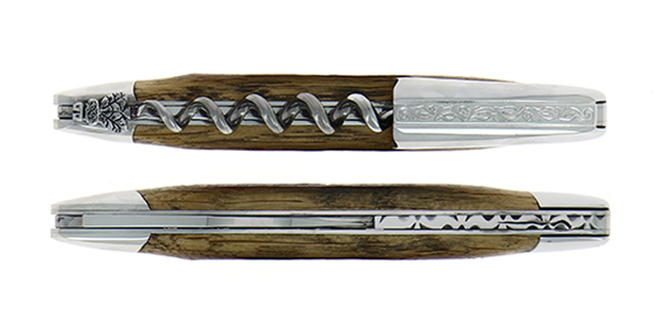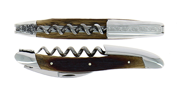 Couteau de sommelier ciselé main en chêne de barrique finition brillante et chape sculptée Pinot