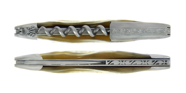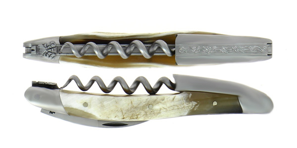 Couteau de sommelier ciselé main en corne de vache Aubrac finition satinée et chape sculptée Pinot