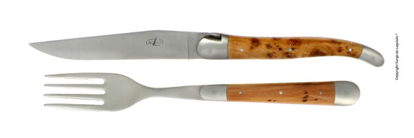 Ce coffret avec le manche en genévrier et une finition satinée est le cadeau idéal. Ces produits vous accompagneront sur vos plus belles tables comme pour vos repas quotidiens.