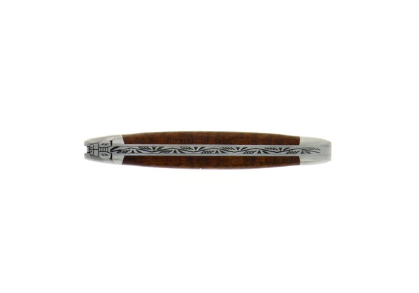 Couteau Forge de Laguiole® en Amourette composé d'une lame en acier Français (T14). Il dispose de deux mitres en Inox qui protègent les extrémités du manche d’un usage quotidien.