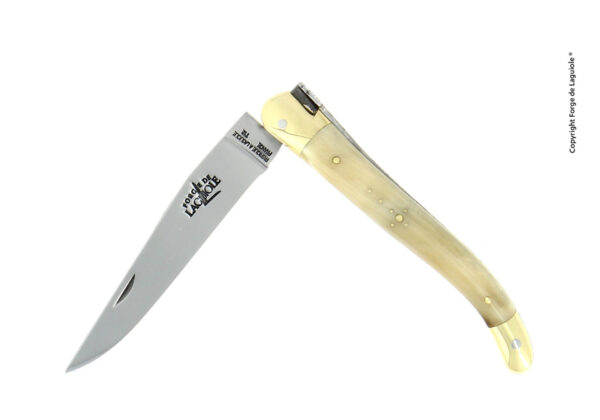 Couteau Forge de Laguiole® en Corne claire composé d'une lame en acier Français (T14). Il dispose de deux mitres en laiton qui protègent les extrémités du manche d’un usage quotidien.