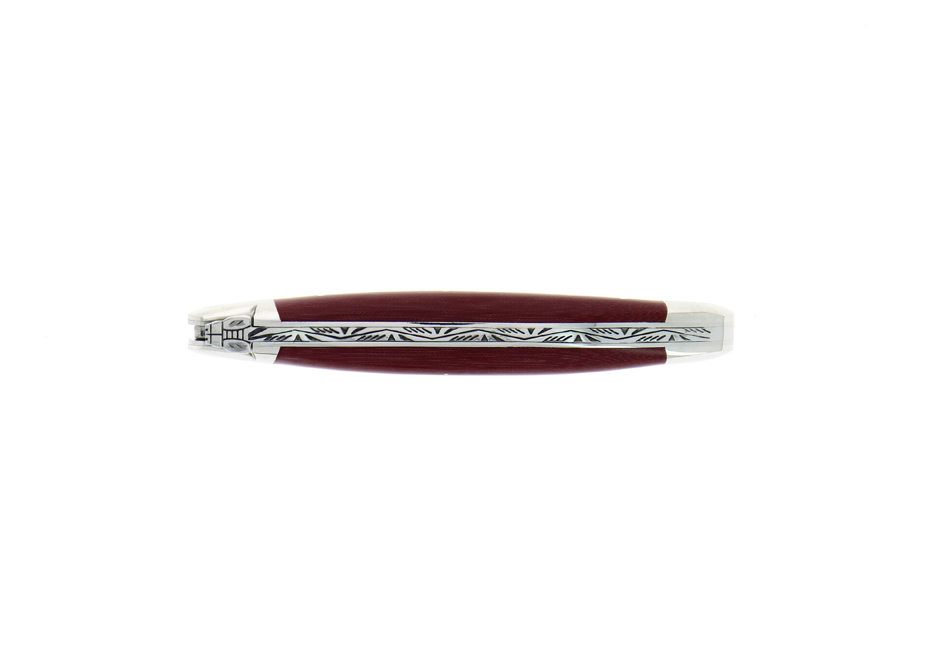 Ce couteau Forge de Laguiole® en Tissu compressé bordeaux composé d'une lame en acier Français (T14). Il dispose de deux mitres en inox qui protègent les extrémités du manche pour un usage quotidien. Nos couteaux sont fabriqués à la main dans notre manufacture à Laguiole.