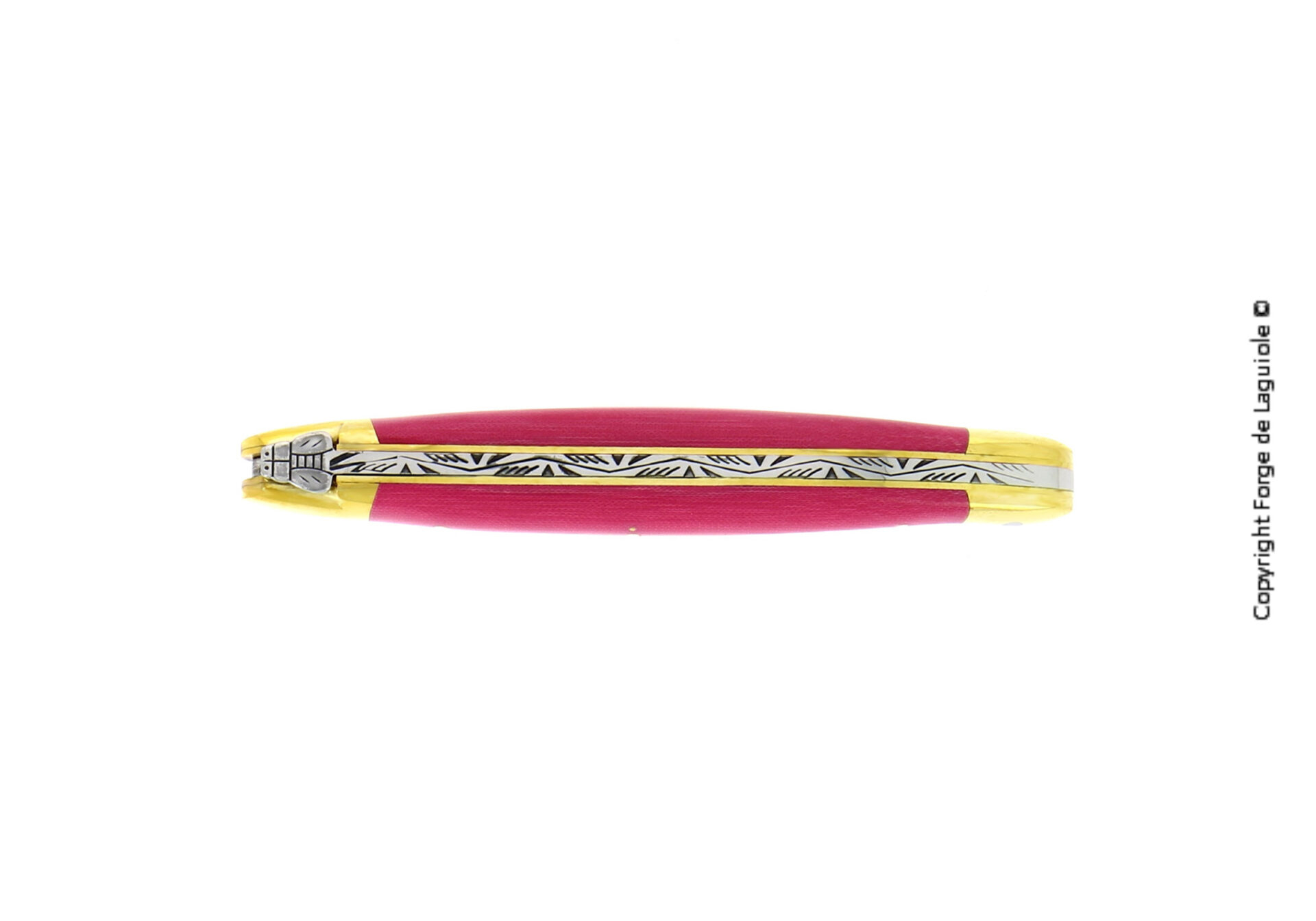 Ce couteau Forge de Laguiole a un manche en tissu compressé rose et une lame forgée en acier Français (T14). Il dispose de deux mitres massives en laiton qui protègent les extrémités du manche pour un usage quotidien.