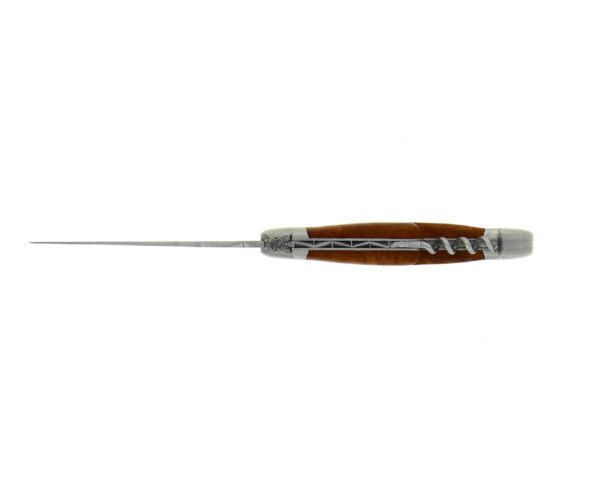 Découvrez ce couteau pliant ciselé main 12cm avec tire-bouchon en bruyère, 2 mitres finition satinée