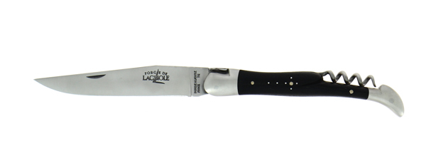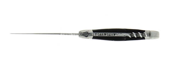 Découvrez ce couteau pliant ciselé main 12cm avec tire-bouchon en ébène, 2 mitres finition satinée