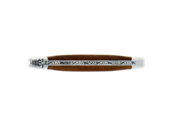 Couteau Forge de Laguiole® en Bruyère composé d'une lame en acier Français (T14). Il dispose de deux mitres en Inox qui protègent les extrémités du manche d'un usage quotidien.