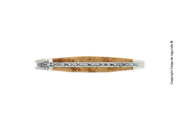 Couteau Forge de Laguiole® en Genévrier composé d'une lame en acier Français (T14). Il dispose de deux mitres en Inox qui protègent les extrémités du manche d'un usage quotidien.
