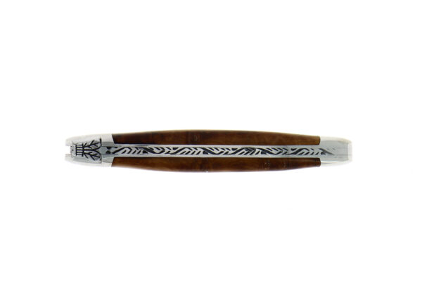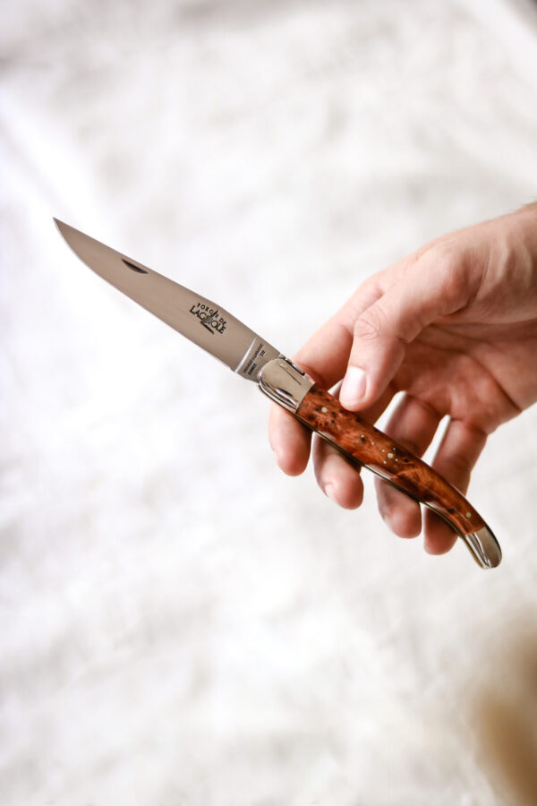 Couteau Forge de Laguiole® en Thuya composé d'une lame en acier Français (T14). Il dispose de deux mitres en Inox qui protègent les extrémités du manche d'un usage quotidien.