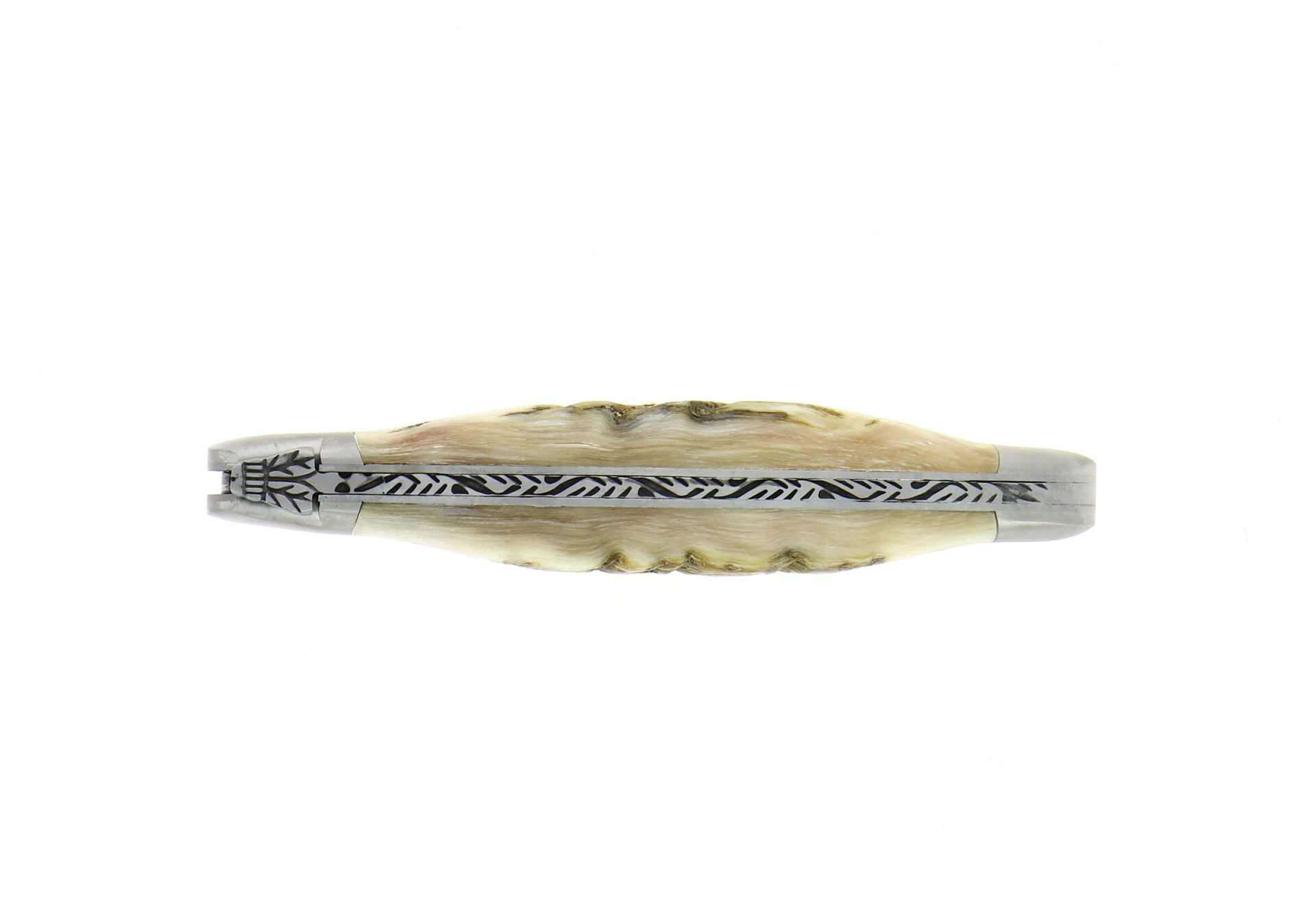 Couteau Forge de Laguiole® en corne de bélier composé d'une lame en acier Français (T14). Il dispose de deux mitres en Inox qui protègent les extrémités du manche d'un usage quotidien.