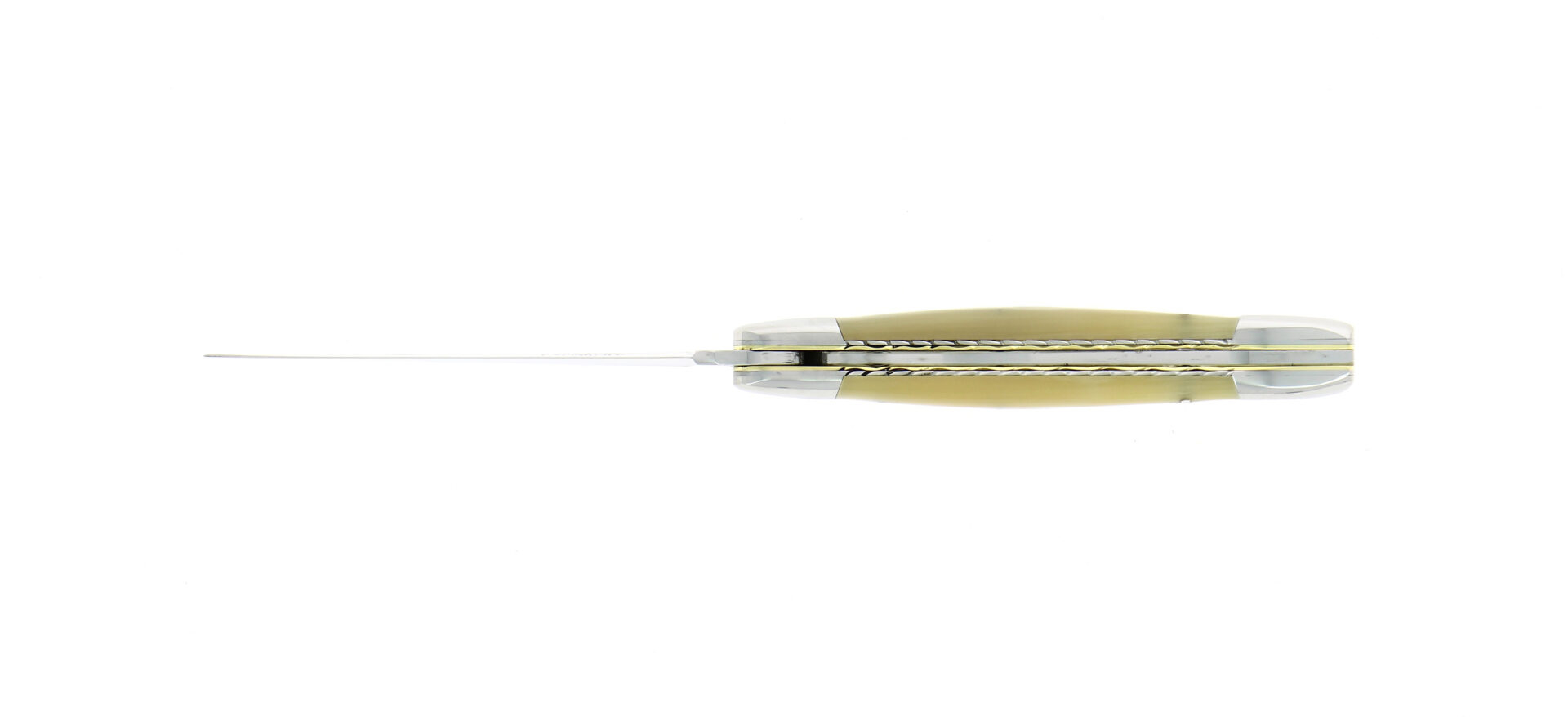 Découvrez ce couteau pliant ciselé main avec tire-bouchon en pointe de corne claire, 2 mitres inox, double platines inox/laiton guillochées dessus et dessous, finition brillante