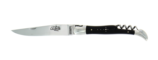 Découvrez ce couteau pliant ciselé main avec tire-bouchon en pointe de corne foncée, 2 mitres inox finition brillante
