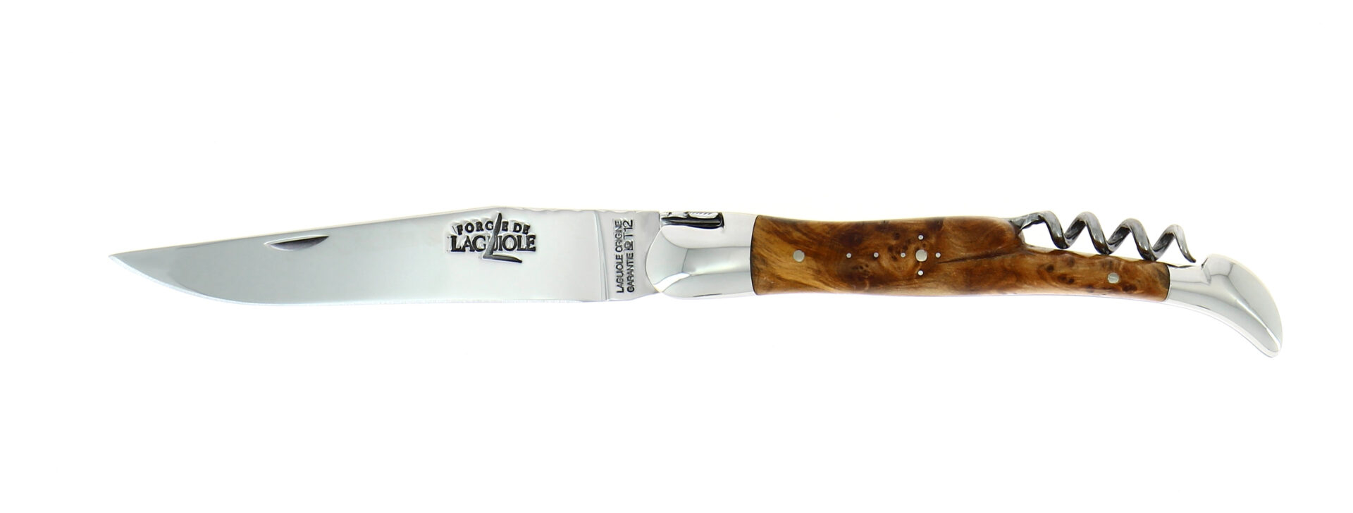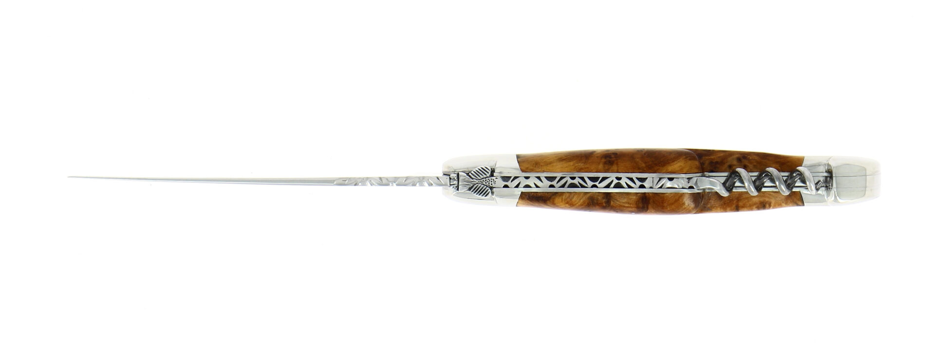 Découvrez ce couteau pliant ciselé main avec tire-bouchon en thuya, 2 mitres finition brillante
