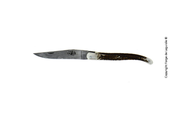 Découvrez ce couteau pliant de la gamme Collection, un couteau Laguiole plein manche en bois de cerf finition brillante et lame damas Carbone.