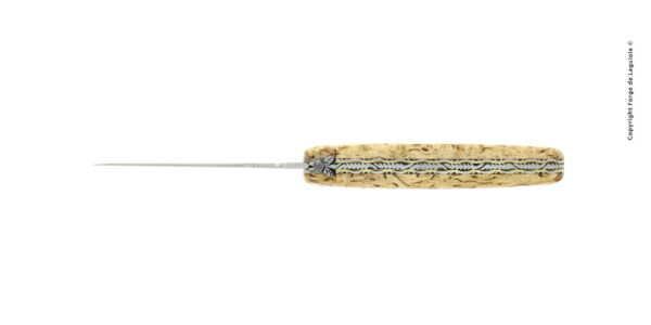 Ce couteau plein manche en bouleau possède des doubles platines laiton-inox entièrement guilloché.