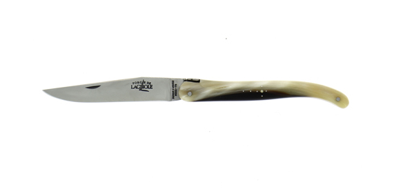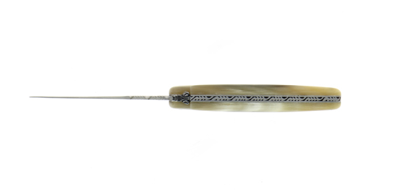 Découvrez ce couteau pliant ciselé main plein manche 12 cm en corne claire finition satinée.