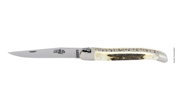 Découvrez ce couteau pliant ciselé main avec un manche 12cm en bois de cerf et des doubles platines guillochées finition brillante.