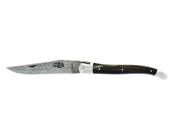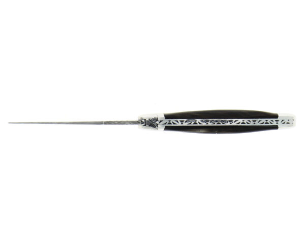 Découvrez ce couteau pliant ciselé main en pointe de corne foncée, 2 mitres finition brillante et lame damas inox.