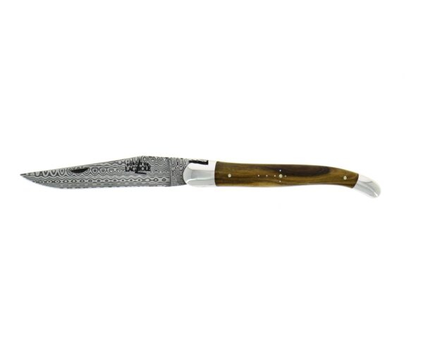 Découvrez ce couteau pliant 12cm en pistachier mitres inox finition brillante et lame damas inox Munin.
