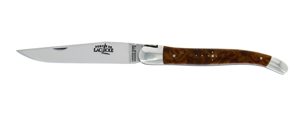 Découvrez ce couteau pliant ciselé main 12cm en thuya, 2 mitres inox finition brillante