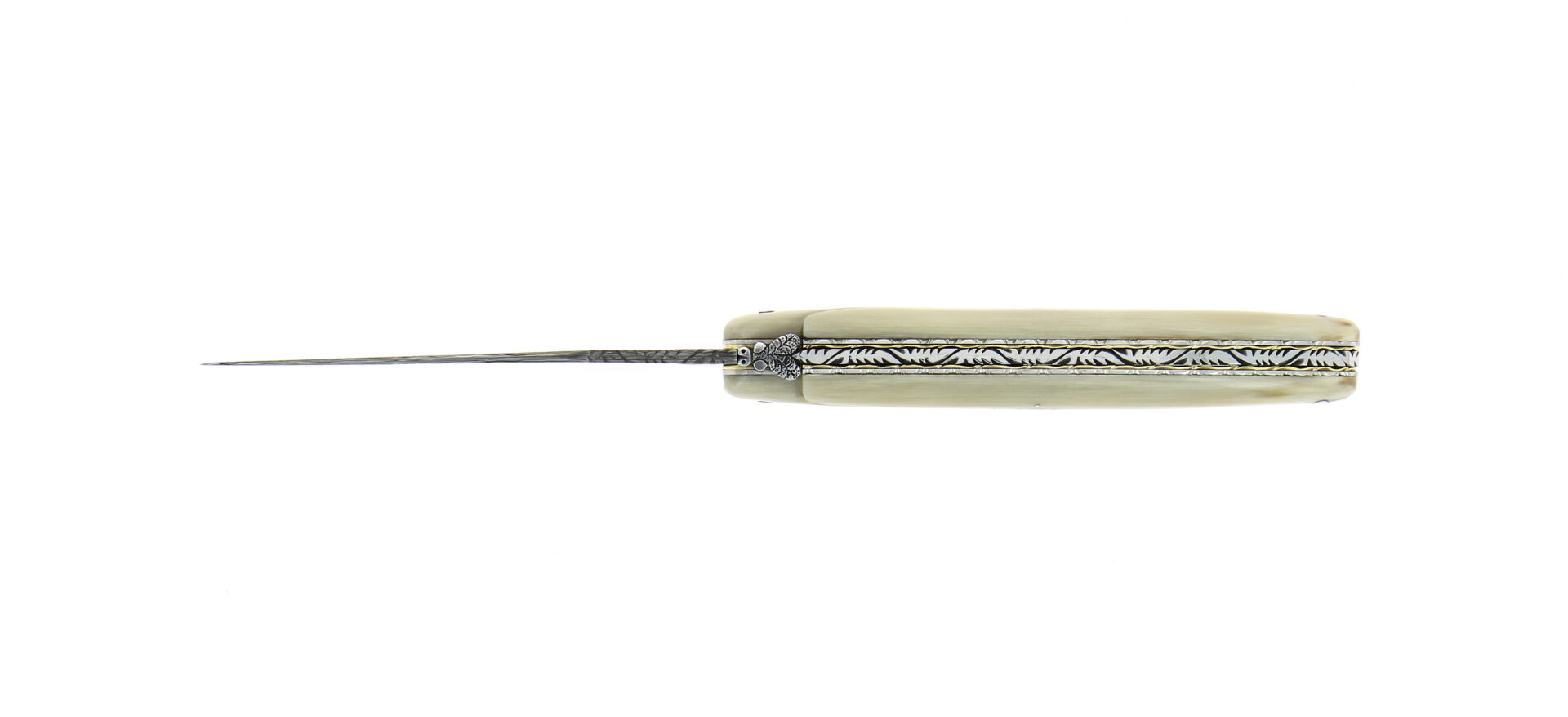 Découvrez ce couteau pliant avec un plein manche en pointe de corne de claire finition brillante et lame damas inox Munin et double platine guillochée dessus .