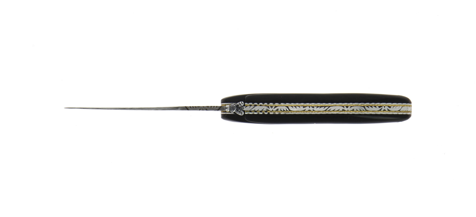 Découvrez ce couteau pliant ciselé main avec plein manche en pointe de corne foncée avec double platine guilloché dessus et lame damas inox Munin finition brillante