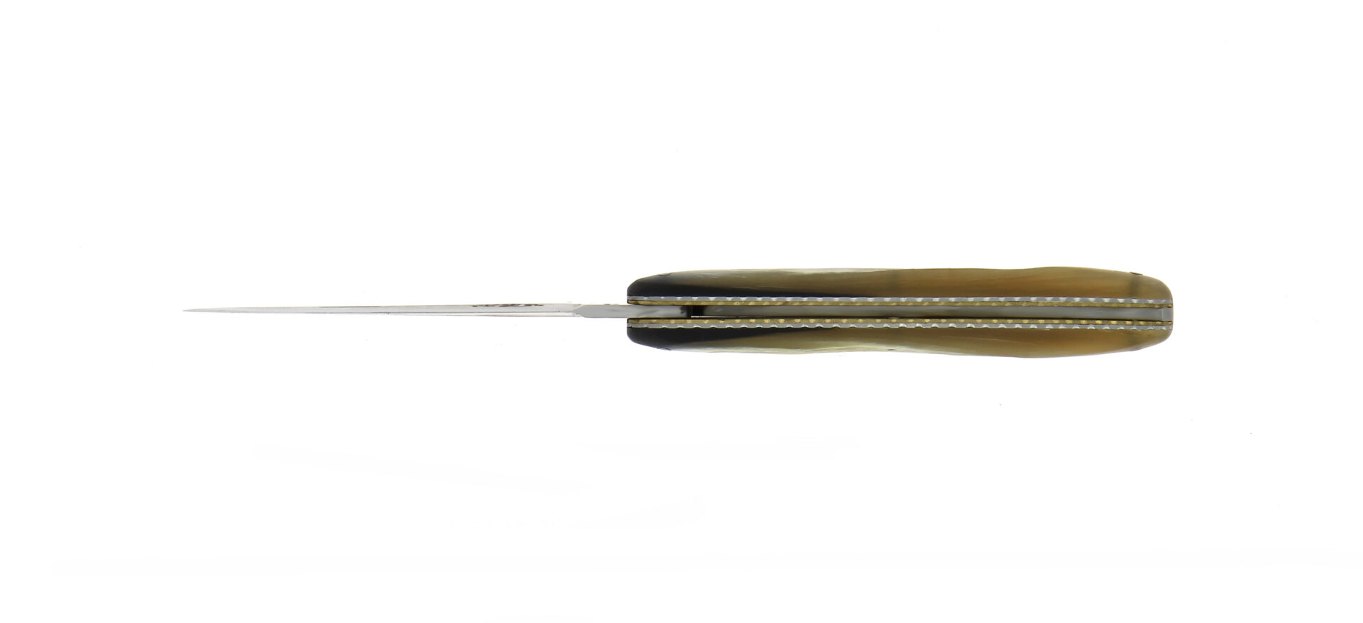 Découvrez ce couteau pliant ciselé main plein manche 12cm en corne de vache Aubrac lame brut de forge double platine inox laiton guillochée dessus et dessous finition satinée