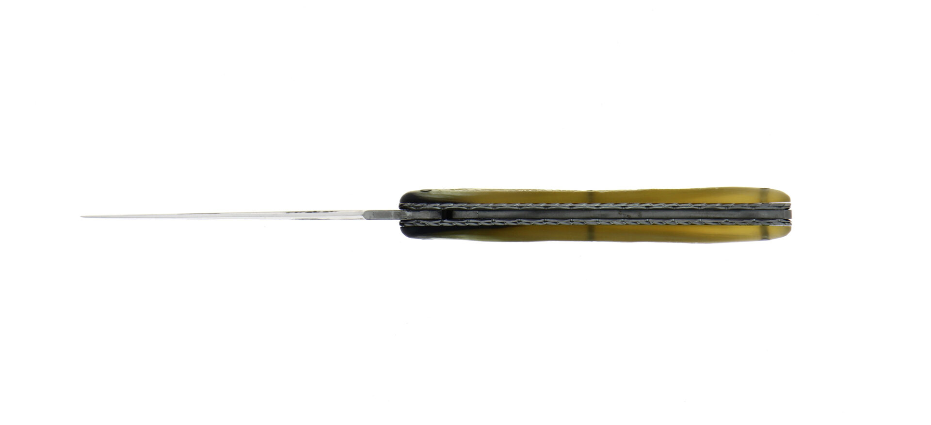 Découvrez ce couteau pliant ciselé main plein manche 12cm en corne de vache Aubrac lame brut de forge double platine inox inox guillochée dessus et dessous finition satinée