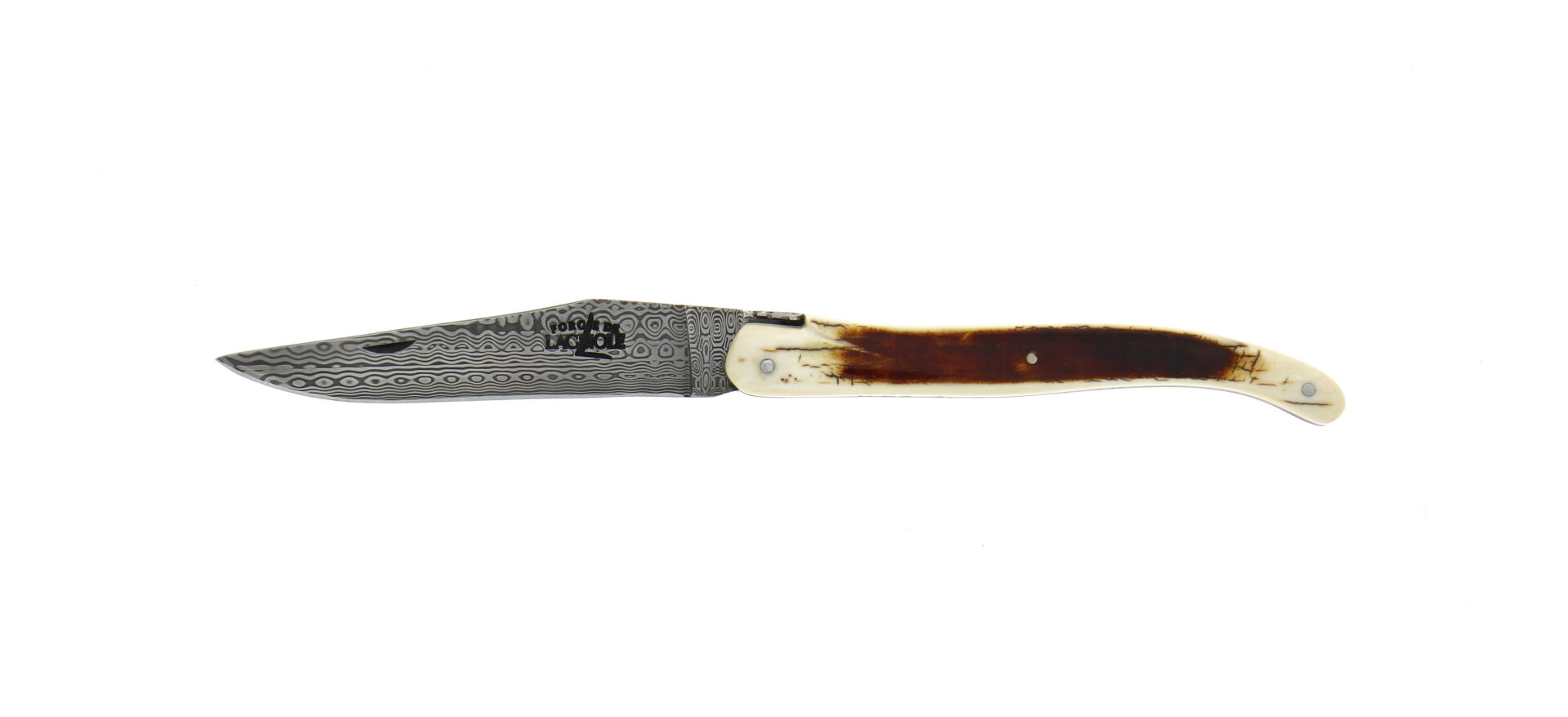 Découvrez ce couteau pliant ciselé main, plein manche en ivoire de mammouth extérieur, lame damas inox Munin, finition brillante