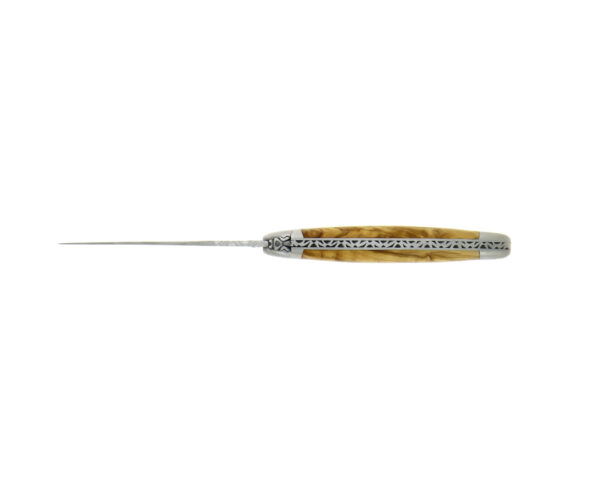 Découvrez ce couteau pliant ciselé main 11cm en olivier, 2 mitres finition satinée