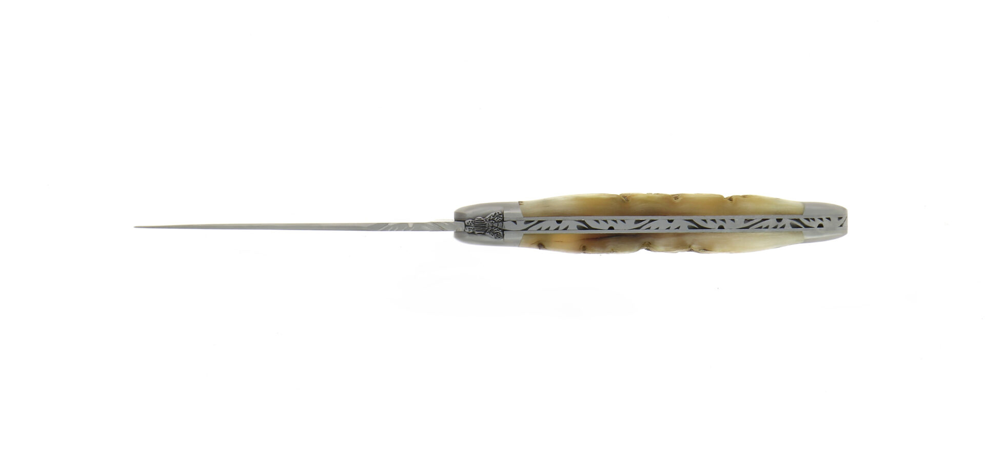 Découvrez ce couteau pliant ciselé main 12cm en corne de bélier, 2 mitres inox finition satinée