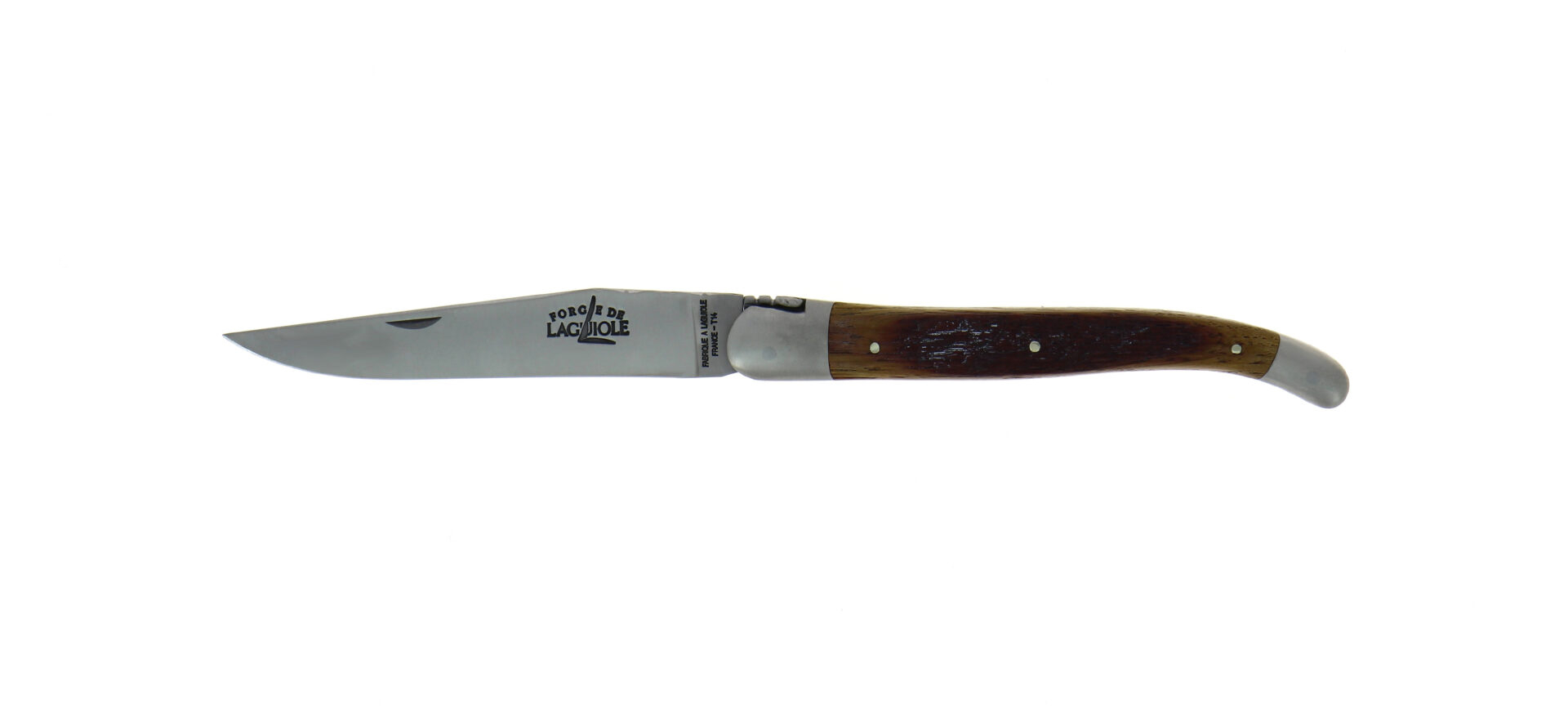 Découvrez ce couteau pliant ciselé main 12cm en chêne de barrique, 2 mitres inox finition satinée
